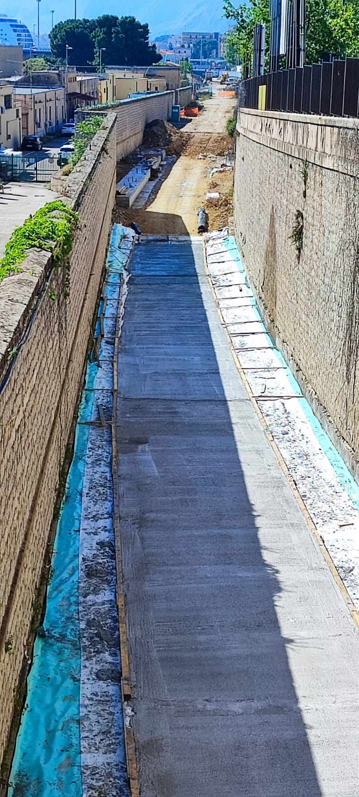 La trincea, come si vede, è interessata dai lavori di realizzazione del fondo, su cui correrà il binario. Si noti, in particolare, l’impermeabilizzazione costituita da teloni in materiale elastoplastico, posizionati al di sotto del massetto in cls che si vede in primo piano. Al di là del tratto in cui è visibile questa lavorazione, ha inizio la parte di trincea che sarà gradualmente approfondita rispetto a quella esistente, fino a raggiungere la quota del fondo della galleria Crispi.