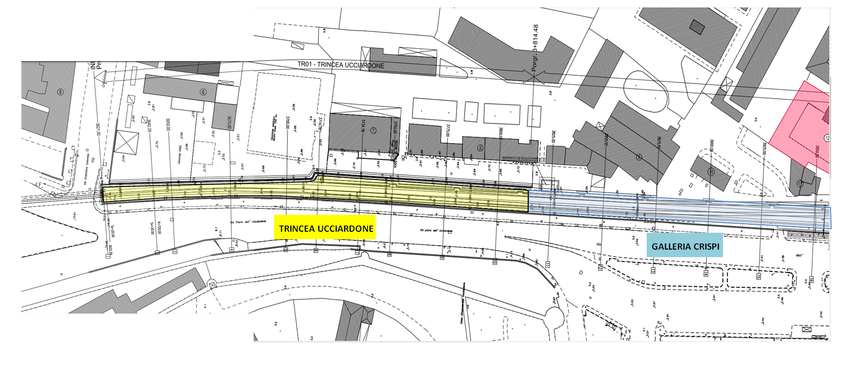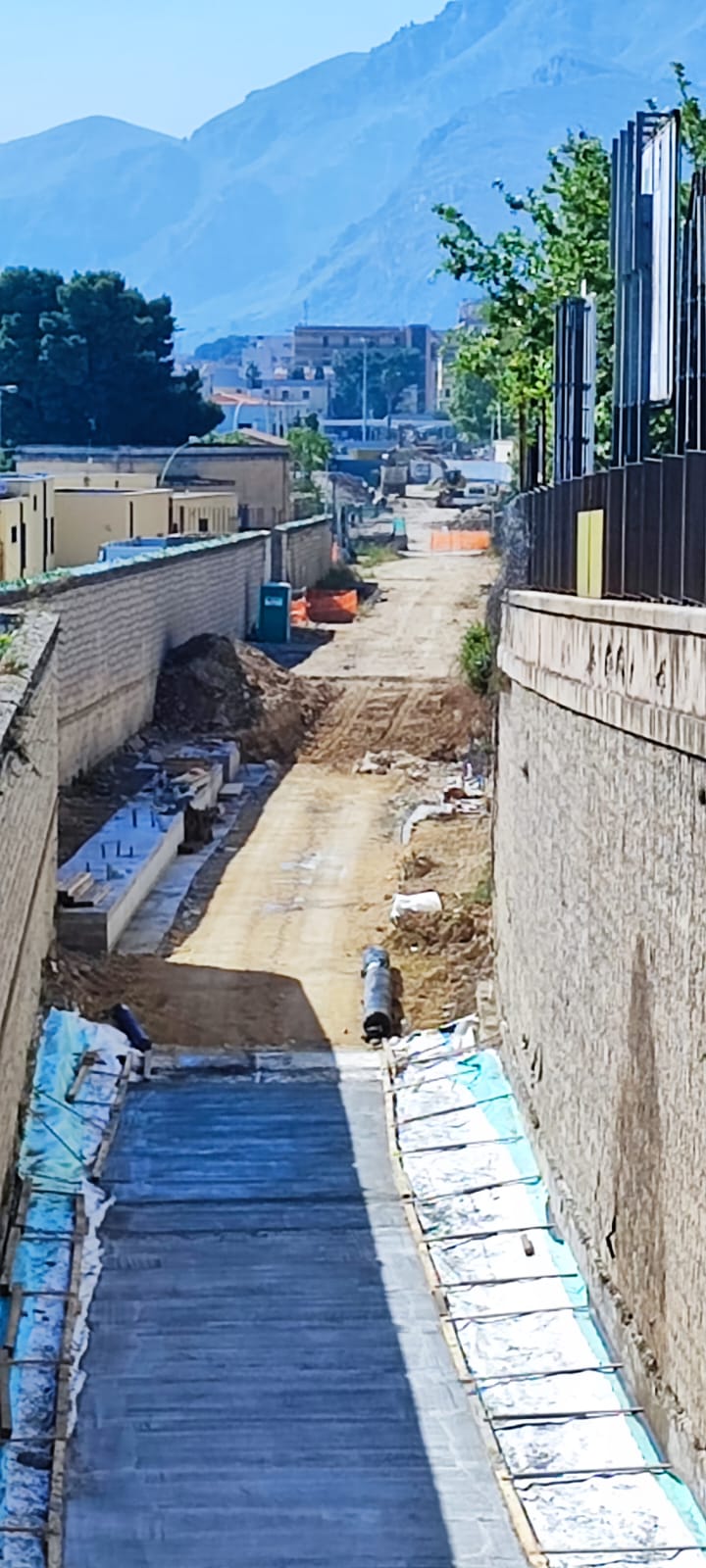 Ciò che si vede nelle foto seguenti è proprio la zona visualizzata in grafica, che comprende la trincea “Ucciardone” e, sullo sfondo, la galleria “Crispi”. Di questa si intravede soltanto il solettone di copertura, appoggiato sopra due file laterali di pali secanti. Si tratta delle due paratie che, a lavori finiti, costituiranno le pareti della galleria.
