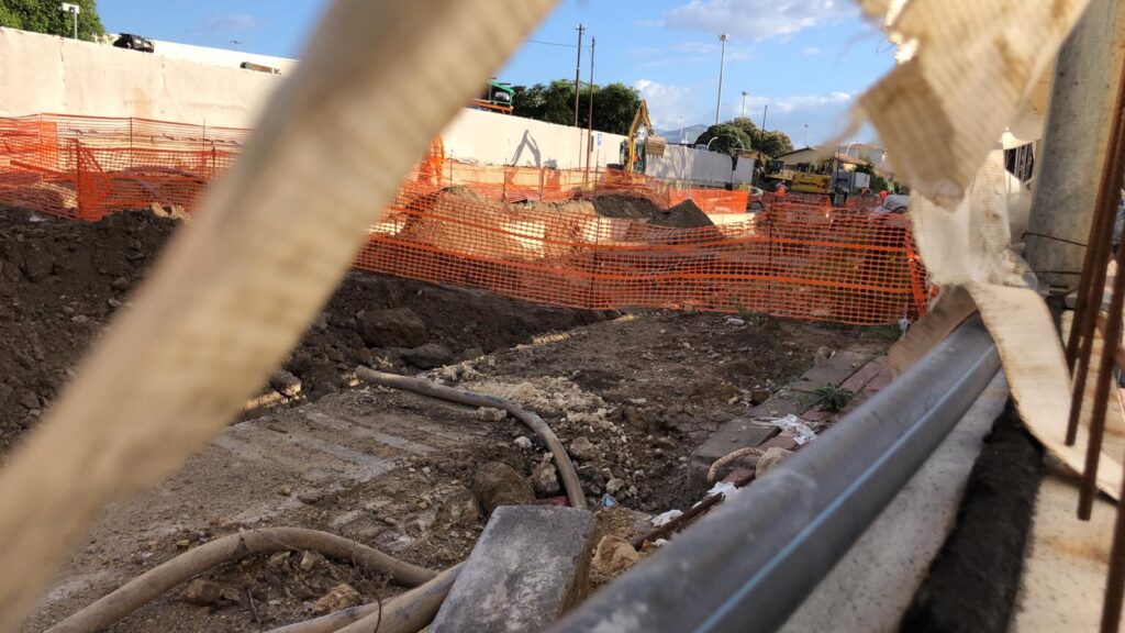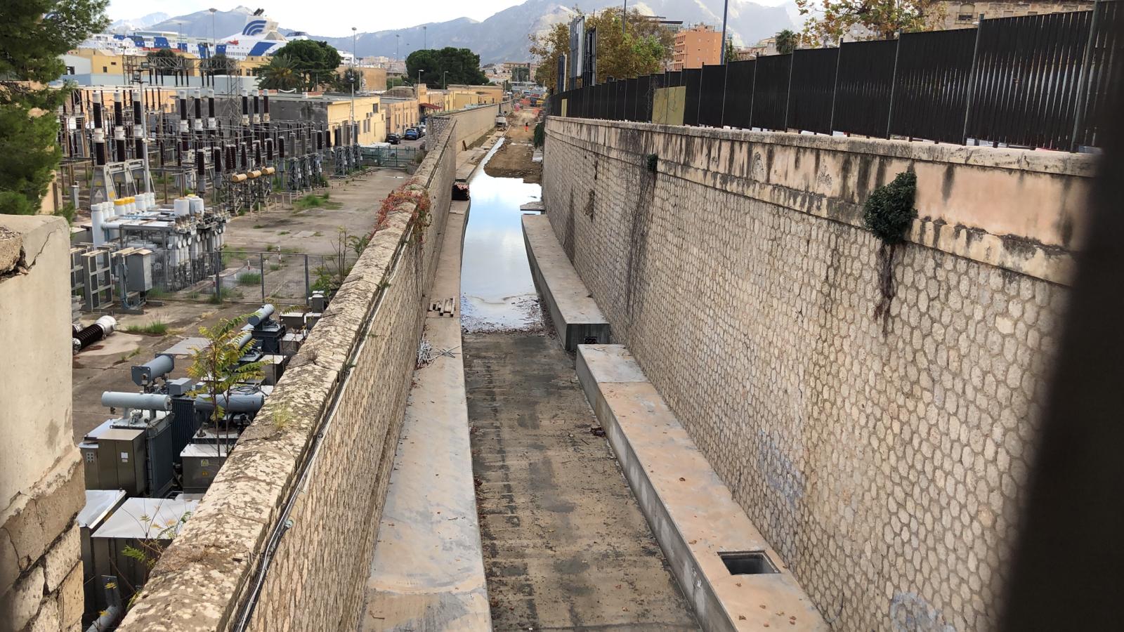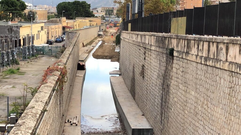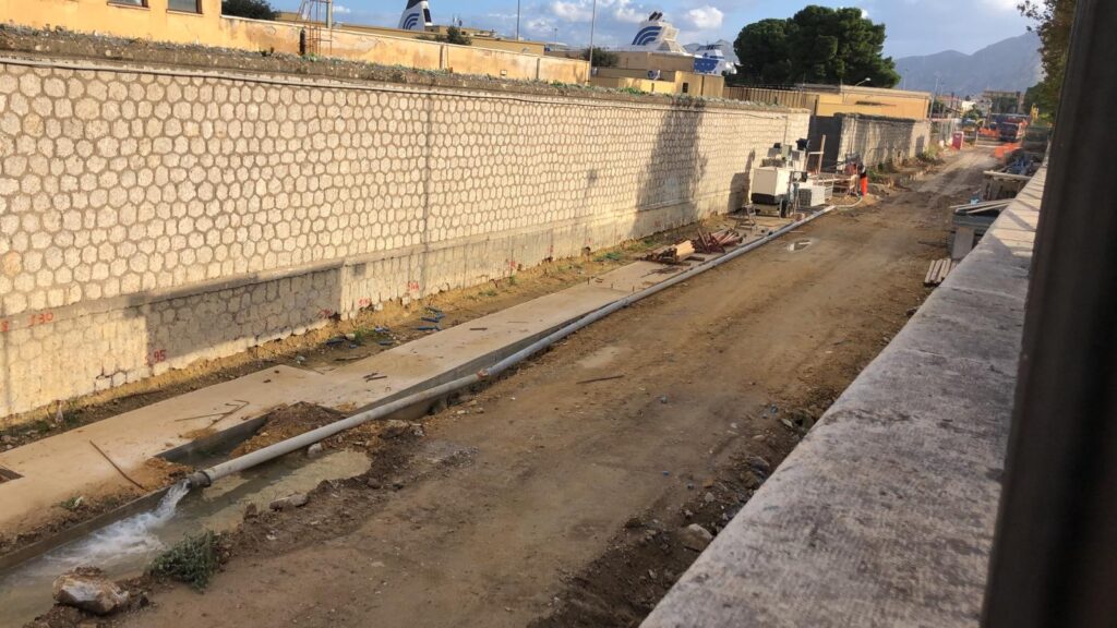 Nelle foto vediamo il tratto in trincea, dove troviamo un notevole ristagno d’acqua, frutto delle ultime piogge. Le lavorazioni che vediamo in corso di esecuzione riguardano la realizzazione di locali tecnici in corrispondenza dell’imbocco della galleria Crispi, da dove si raggiungerà la fermata sotterranea Porto e, più avanti lungo il tracciato, la stazione sotterranea Politeama.