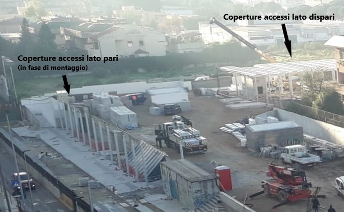 Dal confronto con le ultime foto, che proponiamo in coda all’articolo, vediamo questi progressi. Lato monte, vediamo lo scivolo di accesso verso la carreggiata laterale della circonvallazione, al fianco della quale si sta realizzando un riempimento con terreno vegetale, che viene accumulato anche a fianco del fabbricato al centro nella seconda foto. Si tratta di locali tecnici a supporto del terzo pozzo di ventilazione, destinato a garantire il ricambio dell’aria nella galleria dispari (direzione Punta Raisi) che si trova a 30 metri circa di profondità rispetto al piano di campagna. In QUESTO FILMATO la spiegazione dei dettagli della fermata.