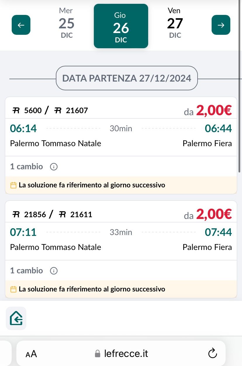 Nonostante la pubblicità ed il clamore mediatico, la comoda fermata omonima (Fiera) dell’anello ferroviario è chiusa. anzi, per l’esattezza, è chiuso tutto l’anello. Compresa la nuovissima fermata Libertà, aperta pochi mesi fa, con le solite fanfare. Chi non ci crede dia un’occhiata allo screenshot immortalato poco fa dal sito “lefrecce.it” (sic!) di Trenitalia, che propone il viaggio da Tommaso Natale (ma sarebbe la stessa cosa da qualsiasi stazione compresa tra Palermo centrale e Sferracavallo) verso Fiera. Per l’indomani. E, particolare non trascurabile, alla modica cifra di 2 Euro.