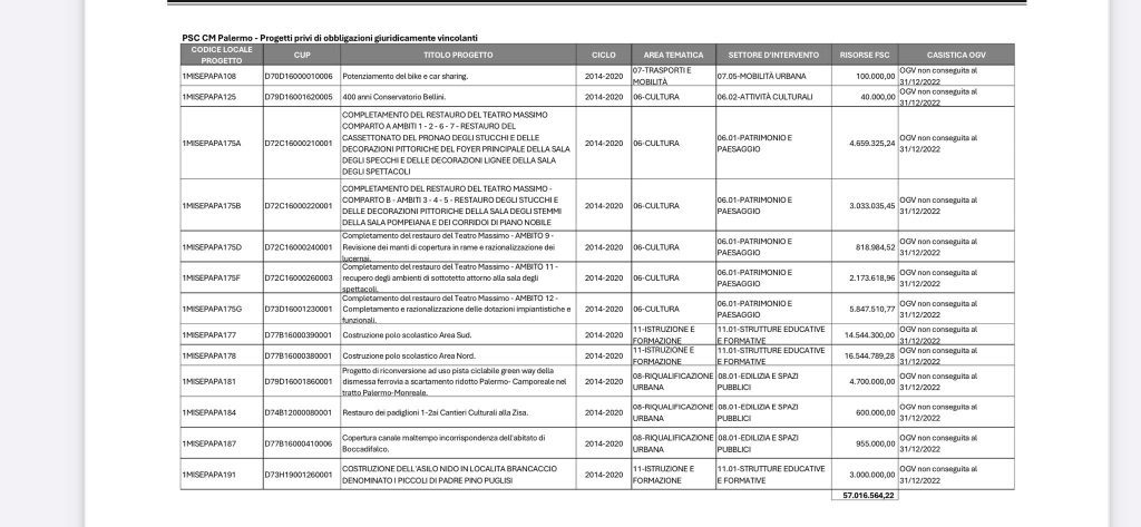 Se Messina piange, Catania e Palermo non ridono. Nel capoluogo ammontano ad oltre 57 milioni i finanziamenti di opere che non hanno dato luogo ad obbligazioni giuridicamente vincolanti. L’elenco è visualizzato nella tabella seguente: tra le opere che non si faranno più, almeno per il momento, due poli scolastici per 30 milioni, la greenway Palermo-Monreale (filmato nel nostro canale Youtube) ed il restauro del teatro Massimo.