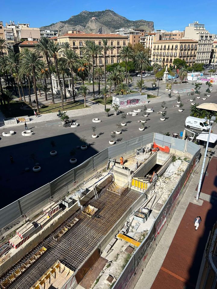 Quello che si vede in figura è il riempimento di una rampa di accesso provvisoria, realizzata per raggiungere la zona di scavo della stazione Politeama e della galleria “Amari”, sotto l’omonima via, in direzione porto. La vedete nell’immagine seguente, indicata dalla scritta in basso a sinistra.